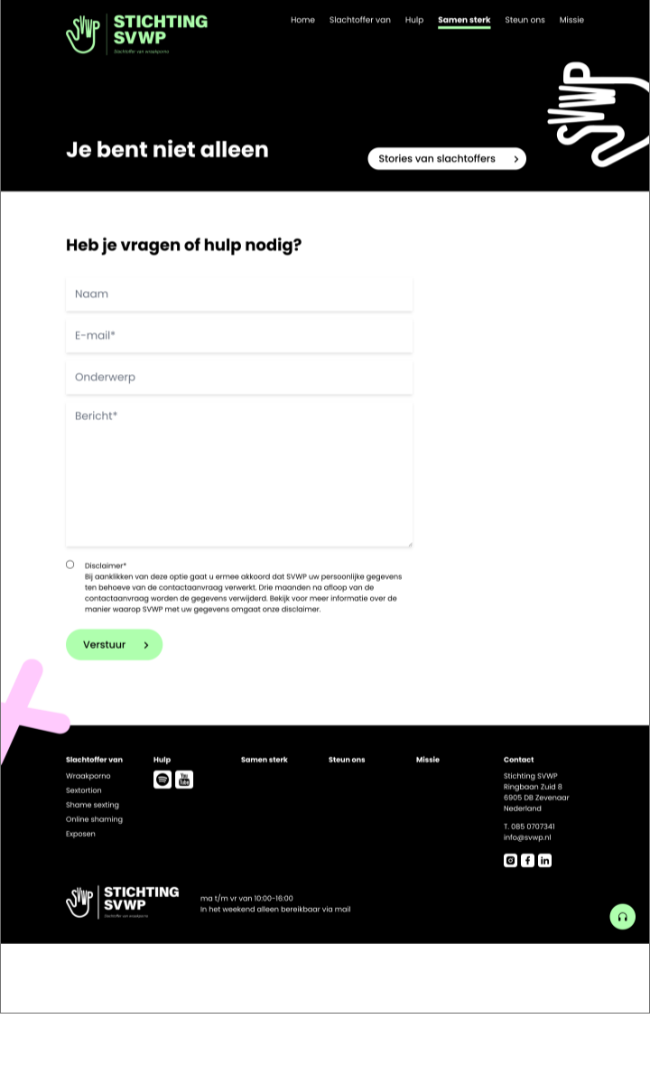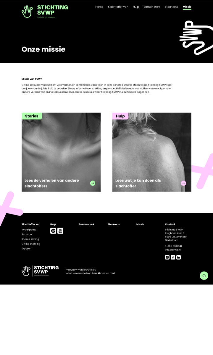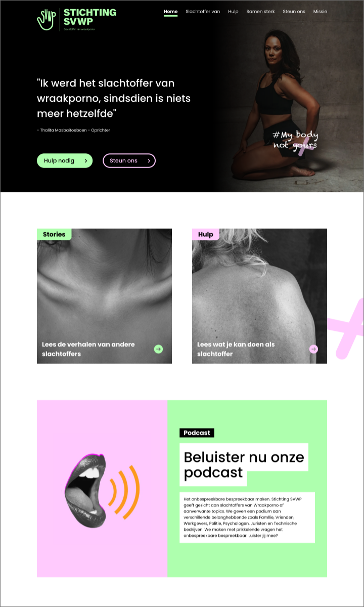 Sinds Thalita Masbaitoeboen slachtoffer werd van wraakporno was niets meer hetzelfde. Bovendien kwam ze erachter dat het lastig is om de juiste hulp te krijgen. Ze richtte Stichting SVWP op, om anderen zoals haar naar de juiste hulpinstanties te begeleiden. Wij mochten de website voor dit belangrijke onderwerp realiseren met een mooie conversational user interface.